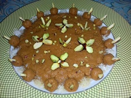 آرد را الک کرده با روغن مخلوط می کنیم و در تابه ای روی حرارت ملایم قرار می دهیم، تفت می دهیم تا به رنگ دلخواهمان برسد. شیر عسلی را هم می توان با شیر و هم از طریق قرار دادن بر روی بخار رقیق کرد. وقتی آرد به رنگ دلخواه رسید، شیر عسلی و زعفران را اضافه می کنیم و بر روی حرارت تا زمانیکه شیر عسلی جذب آرد شود، مواد را هم میزنیم.