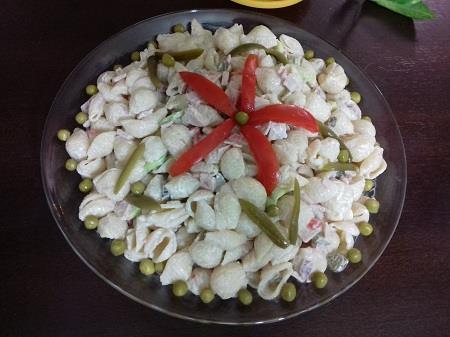 ماکارونی را آبکش کرده، در ظرفی ریخته تمام مواد را به آن اضافه کرده و خوب مخلوط می کنیم. سس را به همراه ادویه ها به سالاد اضافه می کینم و مجدد مواد را با هم مخلوط می کنیم.