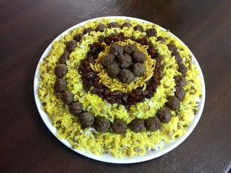 عدس را خیس می کنیم تا نفخ آن گرفته شود سپس با مقداری آب، آن را می پزیم. توجه داشته باشید که عدس نیابد زیاد پخته شود زیرا در زمان دم کشیدن له می شود. سپس برنج را می پزیم و قبل از آبکشی عدس را به آن اضافه می کنیم تا با هم مخلوط شوند. و بعد برنج را آبکش کرده و دم می اندازیم. پیاز را رنده کرده، همراه نمک و فلفل به گوشت اضافه می کنیم و ورز می دهیم. سپس گوشت ها را قلقلی کرده و در روغن تفت می دهیم. کشمش را به مدت نیم ساعت درون آب خیس میکنیم تا در زمان پخت نرم شود سپس با کره آن را تفت می دهیم. بعد از اینکه عدس پلو دم کشید، آن را با زرشک، گوشت قلقلی، کشمش، خلال پوست پرتقال و برنج زعفرانی تزیین می کنیم.