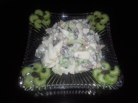 سیب و کرفس را خلالی خرد می کنیم، کشمش و گردو را به آن اضافه می کنیم. برای تهیه سس، مایونز، ماست و آبلیمو را ترکیب کرده به مخلوط سبزیجات اضافه می کنیم و خوب مواد را هم می زنیم تا سس به خورد سالاد برود.