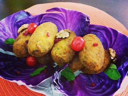 گوشت را در تابه ریخته به همراه کمی روغن، ادویه جات لازم، زرشک و رب تفت می دهیم، سپس از روی حرارت برداشته می گذاریم تا خنک شود. سیب زمینی رنده شده، تخم مرغ پخته رنده شده، گشنیز به همراه گوشت را با هم مخلوط کرده خوب ورز می دهیم. سپس به صورت بیضی در آورده وسط آن را پیاز داغ و گردو می گذاریم، کوفته را می بندیم. ابتدا درون تخم مرغ سپس درون آرد سوخاری می غلتانیم و درون روغن سرخ می کنیم.