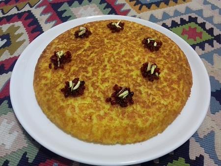 برنج را به مدت 2 ساعت خیس می کنیم سپس آن را آبکش می کنیم. ماست را با تخم مرغ و زعفران ترکیب کرده به برنج اضافه می کنیم و خوب مخلوط می کنیم. سپس درون تابه روغن می ریزیم نیمی از برنج را درون آن می ریزیم، و روی آن مخلوط بادمجان را قرار می دهیم و مجدد از مواد برنج روی آن میریزم و به مدت 45 دقیقه رو حرارت ملایم قرار می دهیم تا بپزد.