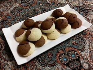 کره و شکر را با هم مخلوط کرده، سپس تخم مرغ، آرد سفید، آرد نشاسته، بیکینگ پودر و وانیل را به آنها اضافه می کنیم و با دست مخلوط می کنیم. خمیر نرمی به دست می آید که به سه قسمت مساوی تقسیم می کنیم. یک قسمت را ساده، یک قسمت را با یک قاشق پودر کاکائو و یک قسمت را با دو قسمت پودر کاکائو مخلوط می کنیم. از هر سه به اندازی یک فندق برداشته، کف دست می گذاریم و قلقلی می کنیم سپس داخل سینی فر که داخل آن کاغذ روغنی گذاشته ایم قرار می دهیم و به مدت 15 دقیقه با دمای 180 درجه داخل فر قرار می دهیم.