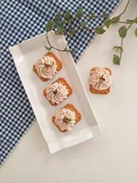 از مواد داخل قیف ریخته و بر روی بیسکوییت ترد شکوفه می زنیم.