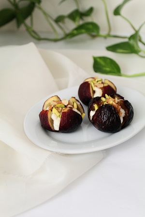 پنیر، عسل و مغزیجات را با هم مخلوط کیند و داخل قیف بریزید و روی انجیرها پایپ کنید. دسر شما آماده است.